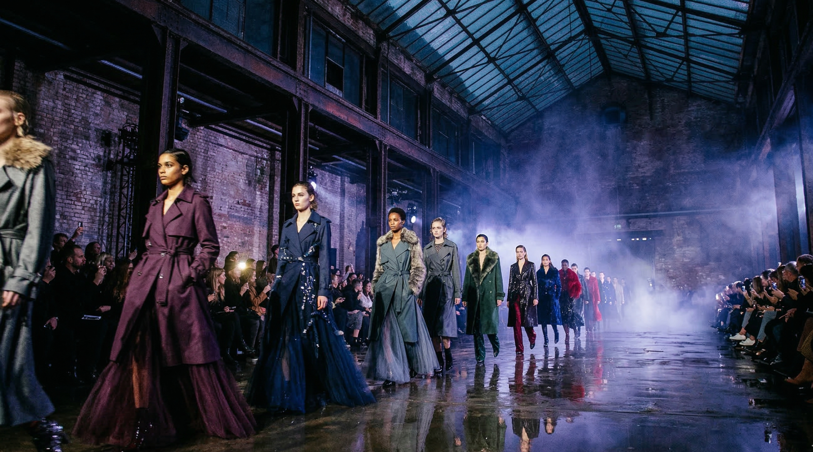 But beyond the spectacle, the clothes landed. Belted leather trench coats, down-filled parkas, quilted bombers, calf-length shearling—all in rich plums, navy blues, slate greys, and pine greens. The classic Burberry trench reappeared in bordeaux leather, ruffled faille, patchwork shearling, house check, and that extraordinary London-map leather version. Romeo Beckham, Rosie Huntington-Whiteley, and Edie Campbell walked. Barry Keoghan, Daisy Edgar-Jones, and PinkPantheress sat front row.